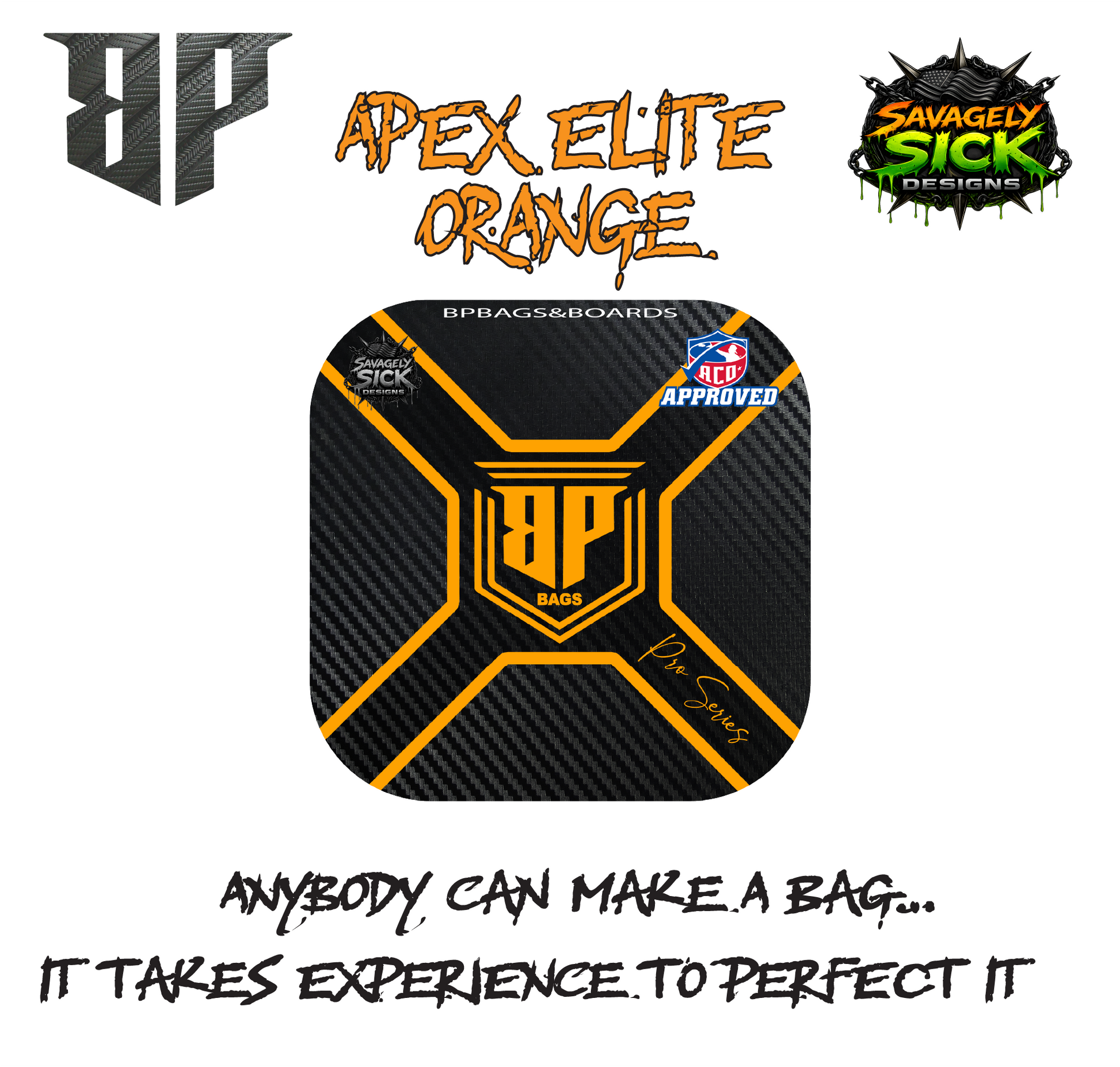 BP Nation! Get the "Apex Elite" Design on any ACO Pro Bag Series we have. Awesome design done by Savagely Sick Designs. This sleek design won't make your bags go any faster but they will be a show stopper for sure on the boards. Don't miss out on the best bags with the best designs!